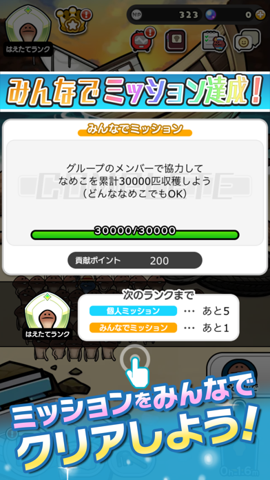 「みんなで栽培」では、最大100人のグループでミッションに取り組みます。新しいイベントが開催するごとに、グループをランダムに振り分け。みんなで栽培用の栽培場でなめこを育てます。みんなと協力してミッションを進め、イベント報酬を手に入れましょう。