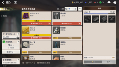 お金がなくては航海ができないので、稼ぎ手段の交易は重要です。入手した特産品などを交易所で売却できますが、需要と供給に合わせて相場は常時変動。売却するタイミングの見極めが大事です。また交易所では、同じく相場が変動する交易品の購入もできます。