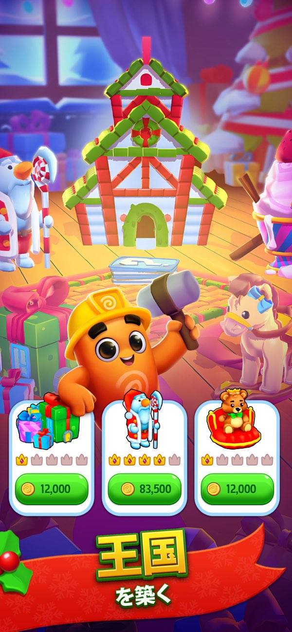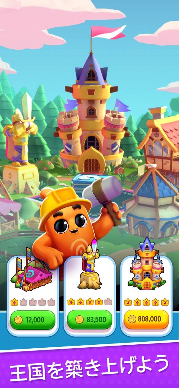GETしたコインを使って、施設の建築ができます。王国の施設レベルは5段階まであり、アップグレードが完了すると、次の王国に進める仕組み。戦略性といった難しいことはせずともゲームが進むので、スキマ時間の暇つぶしにぴったりです。