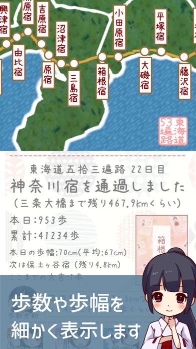 ウォーキングをゲーム感覚で楽しめる歩行計測型のシミュレーションゲームです。毎日の歩数に応じて、江戸から京都までの東海道をどこまで進んだかが可視化されていきます。実際の街道の通過地点や関所が目印となり、ウォーキングの目的地が具体的になるため、日々の散歩がちょっとした旅に感じられます。