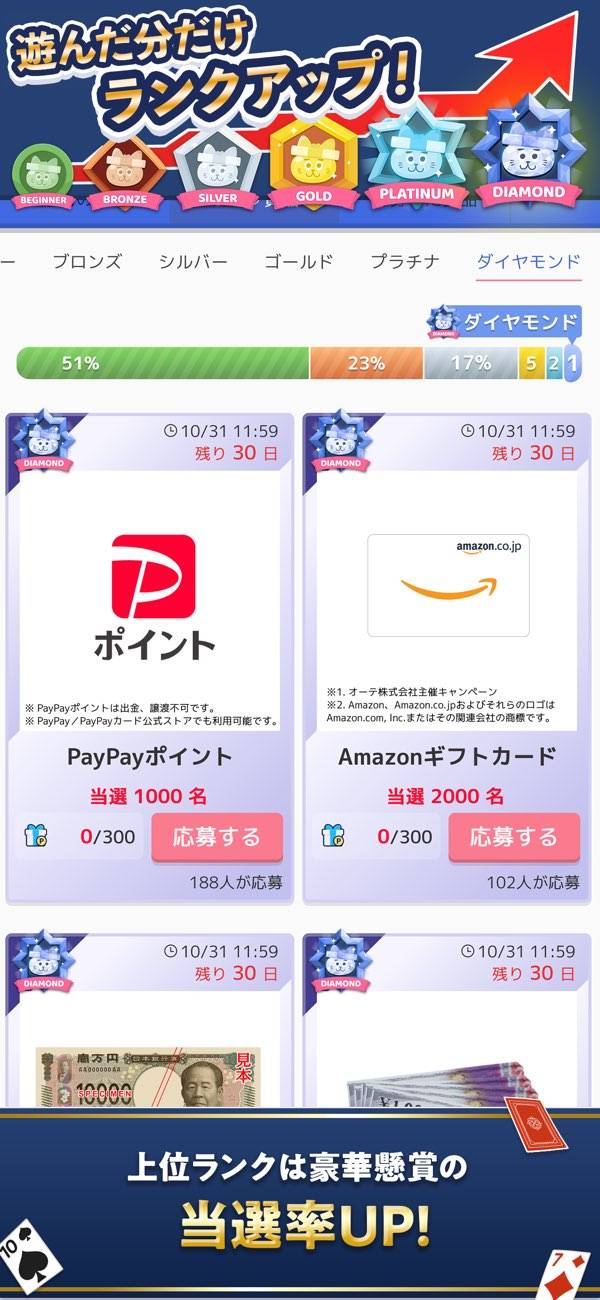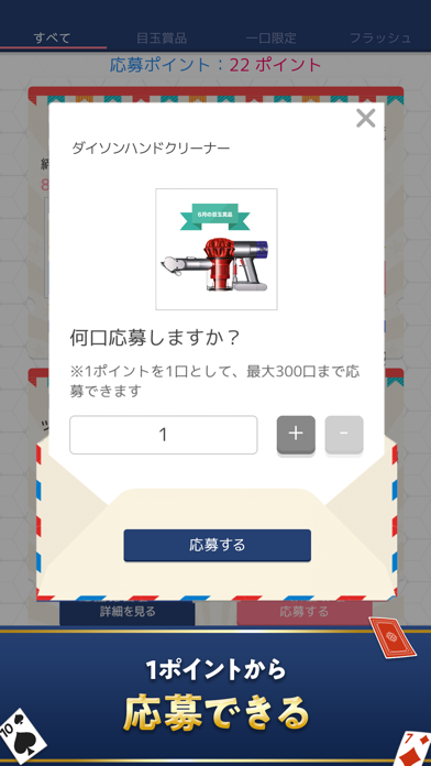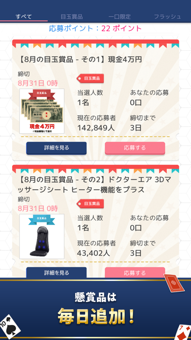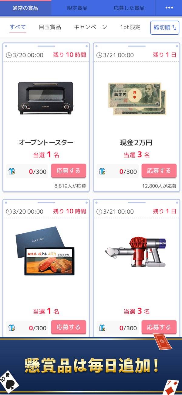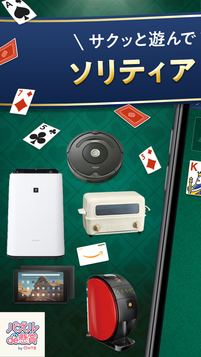 定番のカードゲーム、ソリティアで遊ぶと懸賞に参加できるアプリです。ゲームをクリアすると応募ポイントがもらえ、1ptで1口応募が可能。懸賞によっては300口応募できるものがあります。