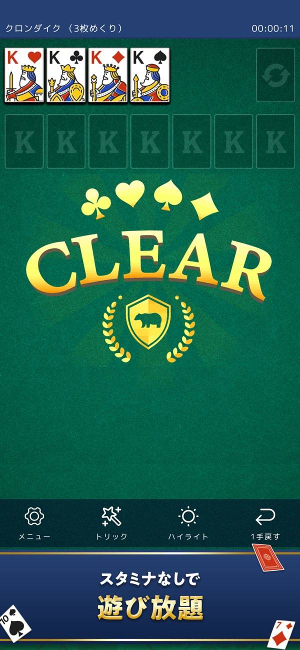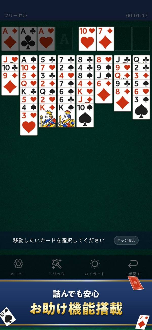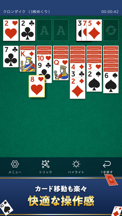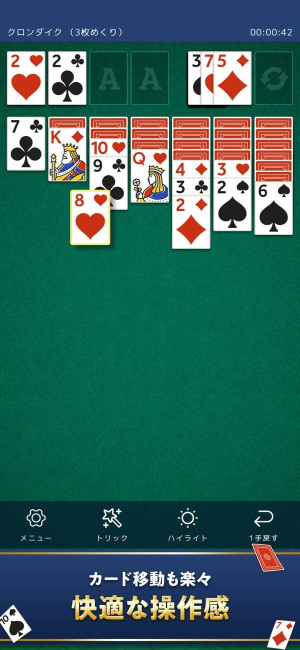 PCゲームでお馴染みの、オーソドックスなクロンダイクソリティアで遊べます。「ハイライト」はヒント、「トリック」は山札や場札から最も低い数字のカードを組札に移動させます。活用すれば有利に進められるでしょう。