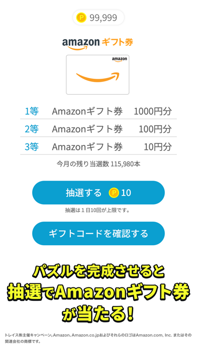 ジグソーパズルを完成させて、Amazonギフト券が当たるくじに挑戦しましょう。当たるギフト券は1,000円分、100円分、10円分の3種類。パズルをクリアすると、ギフト券の抽選に必要なポイントがもらえます。会員登録の必要もなく、アプリをダウンロードすればすぐに始められます。