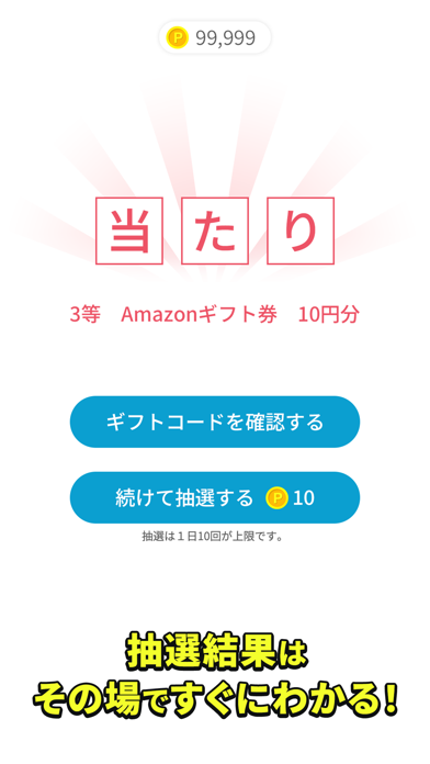 Amazonギフト券の抽選は、抽選後すぐに結果がわかります。当選したギフト券は、画面に表示されるギフトコードをコピペするだけで使えます。パズルを1〜2回遊ぶと抽選1回分のポイントが貯まるので、抽選までのハードルもかなり低いです。
