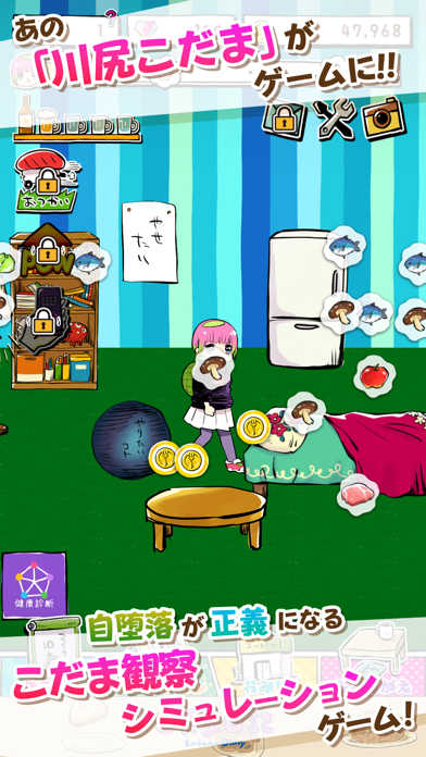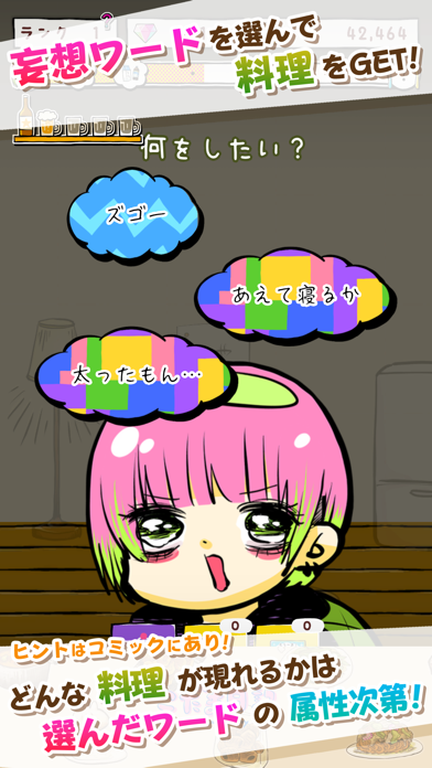 食材集めや妄想ワード選択を繰り返して、料理を出現させます。部屋に浮かぶ食材をタップすると、こだまさんが食材を摂取。こだまさんが妄想するワードを選ぶ場面も。摂取した食材や選んだ妄想ワードの属性によって、最後に出現する料理が変動します。