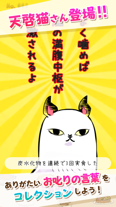 出現料理や妄想ワードはコレクションとして記録。料理を実食すると、その料理のコレクションにある「こだまの一言」が解禁され、ルーツとなった漫画が読めるようになります。特定の条件を達成すると、天啓ネコからのありがたい言葉がいただけるやり込み要素も。