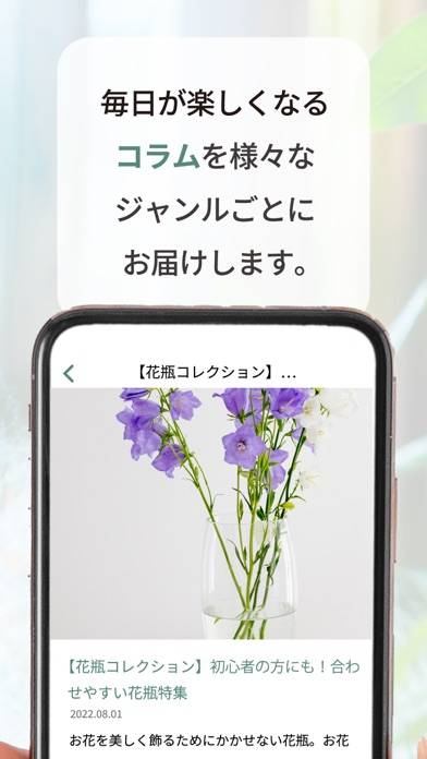 アプリ内の花図鑑やコラムで、花や植物の知識を学べます。花図鑑には、置き場所や水やりなどお手入れ方法が種類別で記載。コラムには、花の散策手段やおすすめの花瓶などタメになる情報が見られます。花を育てる初心者の心配や不安も和らぐでしょう。