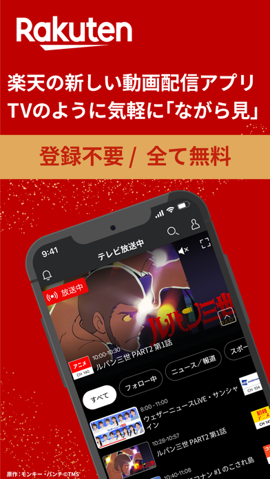 楽天が運営しているリニア型動画配信サービス。会員登録は不要で、誰でも無料で番組を視聴できます。アニメ・映画・スポーツ・ニュース・音楽など幅広いジャンルの番組を放送。リモコンでテレビのチャンネルを変えるように、視聴する放送番組を変更できます。見逃し配信やリマインダー機能にもしっかり対応。