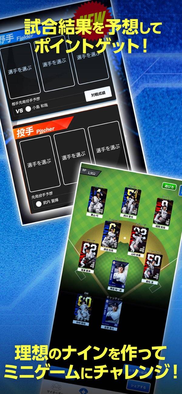 実際の試合の選手成績を毎日予想できます。当日の試合が始まる前までに、お題に沿った選手を3人まで予想してカードをセット。試合結果に応じて獲得したポイントで、ガチャ用のコインなどの特典がもらえます。
