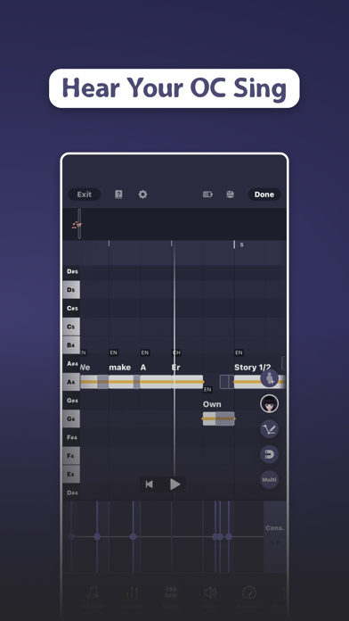 歌詞や音程をつけて、オリジナルの曲を作ってみましょう。アプリ内から使い方の紹介動画が見られたり、元から歌詞や音程がついているサンプルがあったりと、初心者でも楽しめる工夫もされています。MIDIのデータの読み込みにも対応。
