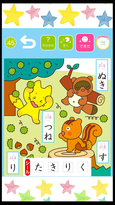 コースごとに遊び方が異なりますが、しっかりと解説がついています。まだ文字が読めない場合でもナレーションがあるので安心。文字や数字、形や色、さらには動物や乗り物といったさまざまなテーマを扱った問題が収録されています。