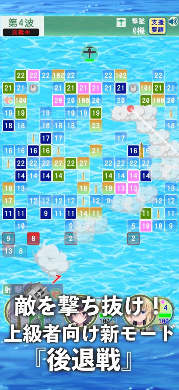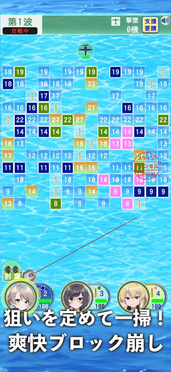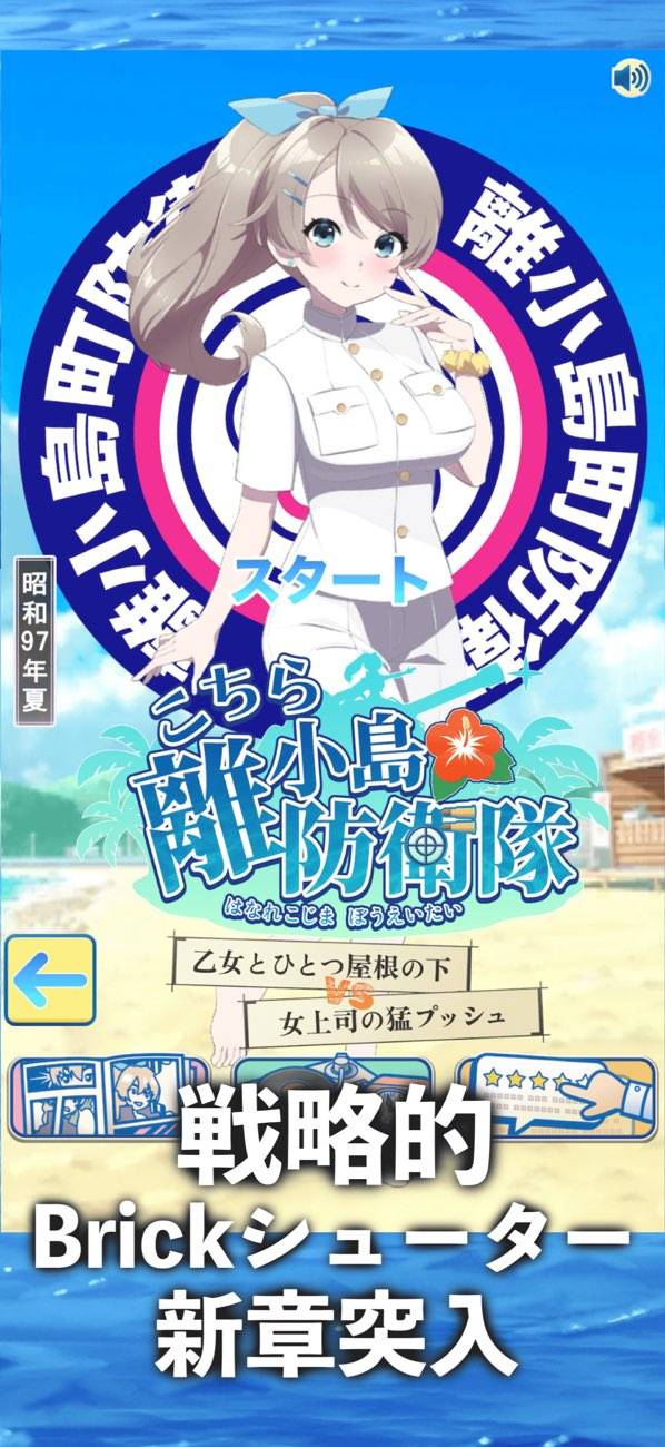 青年が流れ着いた島で、日本に帰るため美少女と共に敵機を迎撃するゲーム。3人の水着姿の美少女の好感度を上げながら、ブロック崩しシューティングを楽しめます。操作は射出角度と強さをスワイプで決めて、指を離すだけ。あとは飛んでいった弾がブロックを崩しながら敵機を撃ち落としてくれるのを祈りましょう。
