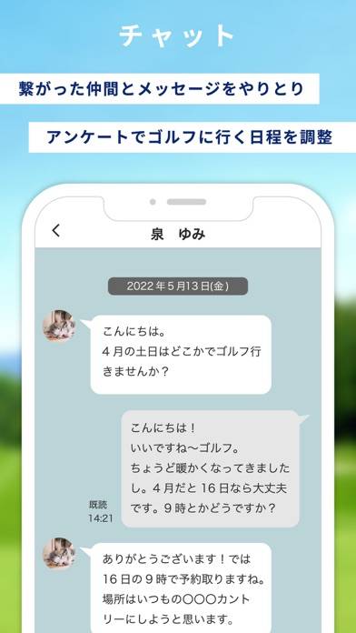 現在地や登録住所をもとに、近くにいるゴルフ好きのユーザーが一覧で表示されます。スコアや評価なども確認できるので、自分と相性の良さそうな相手を探しやすいのがうれしいポイント。マッチングが成立すればそのままチャットやグループチャットがスタート。日程調整用のアンケートも作れるので、気軽にやりとりができます。