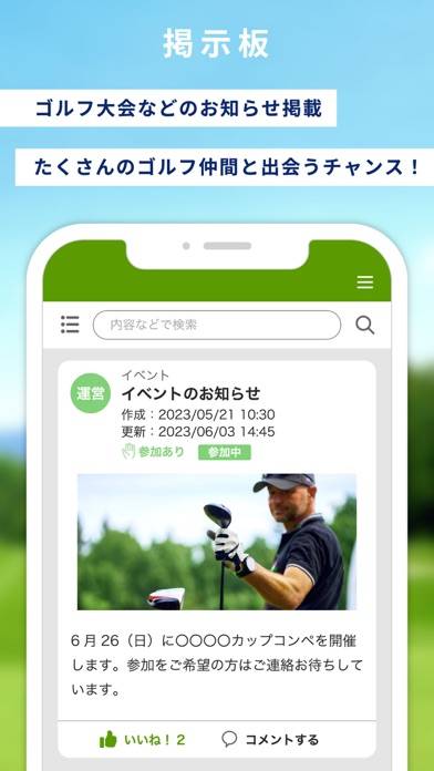 - イベント掲示板で地元のゴルフ情報が手に入る