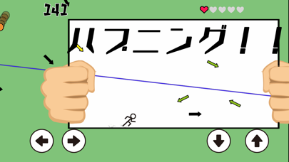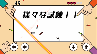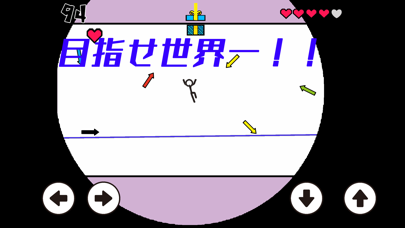 四方八方から襲ってくる矢印をひたすら避けましょう。スコアは毎秒1点ずつ獲得できますが、攻撃をギリギリで避ける「神回避」に成功すると5点もらえます。ライフがすべてなくなるとゲームオーバー。ジャンプやスライディングを駆使して神回避を狙いましょう。