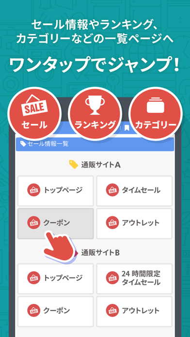 買う商品が特に決まっていない時でも、量販店を歩き回る感覚で安く買い物。Amazon、Yahoo!、楽天市場、LOHACOのセール・クーポン情報へもアクセス可能となっています。