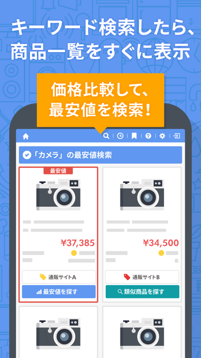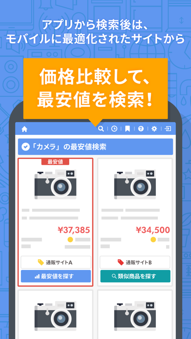 「買った後で、もっと安く買う方法が見つかった」という失敗のリスクを軽減。Amazon、Yahoo!ショッピング、楽天市場、LOHACOの各ショッピングサイトを横断検索し、最安値を割り出せます。さらに検索対象が拡大し、メルカリやau PAYマーケット、Qoo10なども検索可能に。