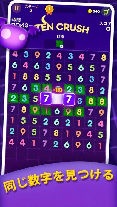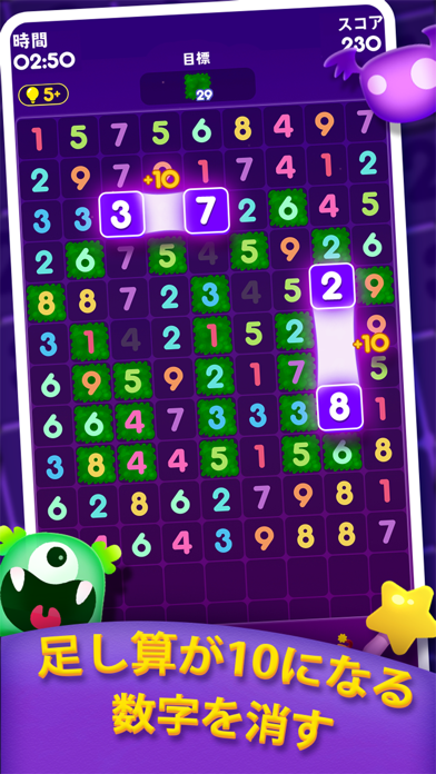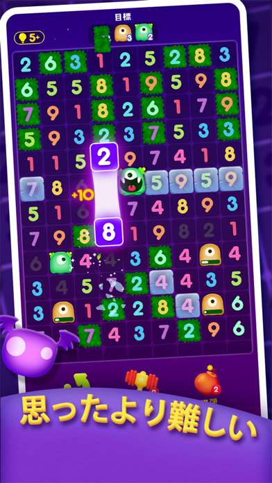 同じ数字や、8+2など足し算が10になる数字を消せます。どちらも数字同士が隣接していないと消せません。ターゲットの数字をすべて削除したらクリアです。消す順番次第では手詰まりになることもあるので、数字を消す際は慎重に考えましょう。