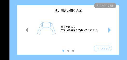 視力を自宅で簡単に測れるアプリです。本アプリを起動して、腕を伸ばし指示に従って視力検査を行えば、ある程度自分の視力がわかります。日常生活で目が見えにくくなったと感じたら、ぜひ使ってみてください。