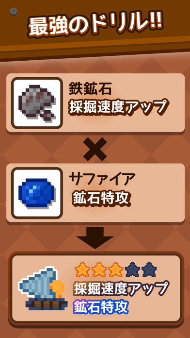 設計図をもとに鉱石をパズルのようにはめて、強力なドリルを作成。鉱石ごとに形が決まっていて、隙間なく鉱石で設計図を埋めていきます。また素材にした鉱石ごとに、ランダムな特殊効果がつくことも。最強のドリルを作れば、採掘がさらにはかどります。