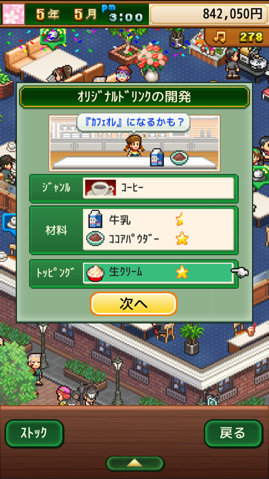 最初は店員が1人しかいない小さな喫茶店を経営。座席や設備を置いたり、改築を重ねたりして規模を大きくしていきます。ゲームが進行すると床の色を変えられるようになり、雰囲気をガラッと変更できますよ。