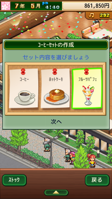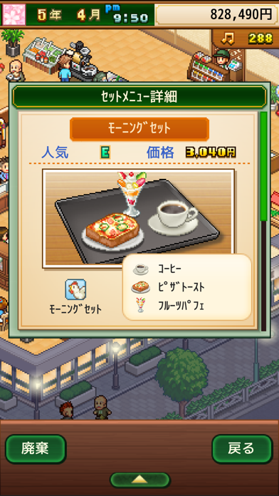 コーヒーに合うのはやっぱり、バタートースト。ゲーム序盤のメニューはドリンクのみですが、ゆくゆくは料理を作れるようになります。オリジナルのモーニングセットを開発すれば、お客さんがもっと喜んで、喫茶店の売上も増えるかも。