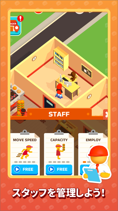 スタッフの増加や移動速度アップを行えます。青色の「自由」ボタンをタップすると動画広告が流れ、アップグレードが可能。バーカー屋で稼いだお金でもアップグレードできます。