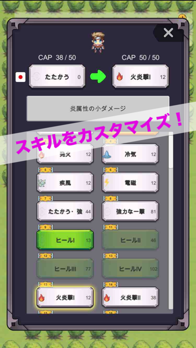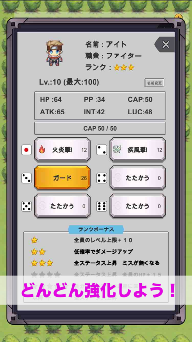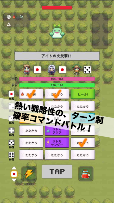 サイコロの出目で行動を決めるターン制バトル。出目で技を決めるため、運任せのドキドキ感が魅力です。PPを使って、特定の目が出る確率を操作することも可能。どうしても魔法で回復したいときなどに使いましょう。スキル以外の確率を上げてくるイジワルな敵も。