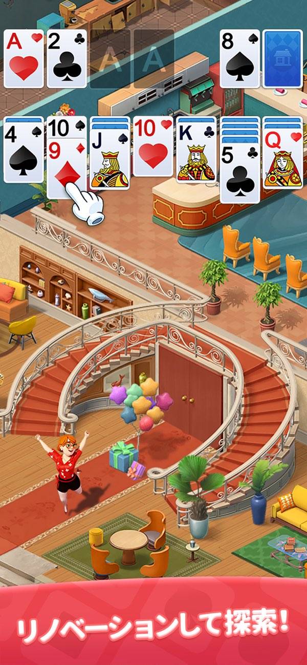 クロンダイクソリティアで遊びながら、リゾートホテルを復興を目指します。ソリティアをクリアするともらえるコインで、南国感あふれるインテリアをホテル内に設置可能。初心者から上級者まで楽しめる機能が充実しており、3カードモードや左利きモードなど幅広いユーザーに対応しています。
