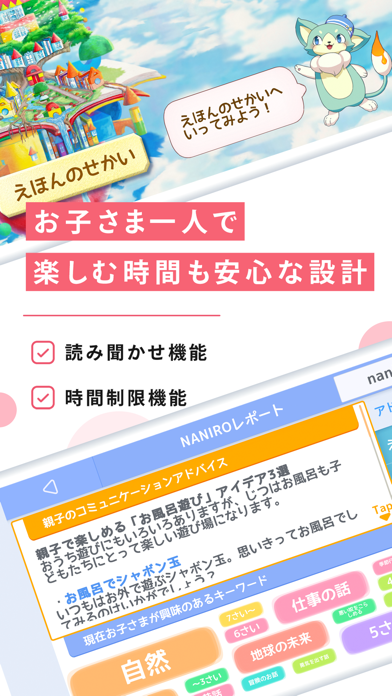 絵本の種類が豊富だから、子どもが飽きずに長く楽しめそう。読み聞かせ機能があって、文字が読めない子どもでも楽しめるところも◎。レポートを見れば、子どもの興味関心がわかるのも嬉しいな。コミュニケーションアドバイスを活用して、子どもとの絆をもっと深めるぞー!