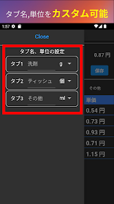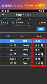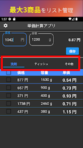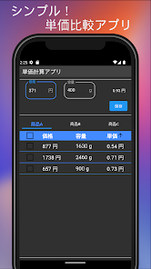 - 一度に最大3種類の商品の単価比較が可能。データの保存もできる
