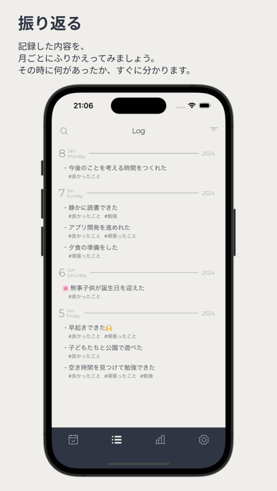 ふと思ったことや出来事を箇条書きで素早く記録。難しい文章を考える手間がなく、手軽に続けやすいです。また、月ごとや指定期間の日記を振り返ったり、ダッシュボードで日記をつけた日数や箇条書きの数を確認したりできます。