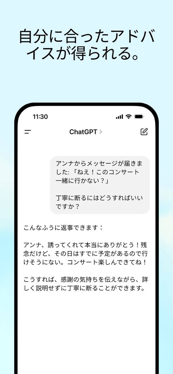 音声アイコンをタップするだけで、まるで人と話しているような自然な会話が可能。本当に人が話しているような感覚なので、相談事もしやすいです。