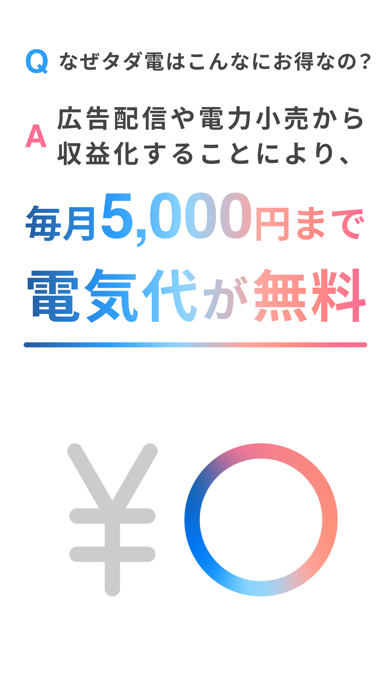 電気代が毎月最大5,000円無料になる電力会社「タダ電」の公式アプリです。支払いは5,000円の超過分のみ。アプリから申し込みができ、切り替え工事不要、入会・解約手数料も無料という手軽さもアピールされています。
