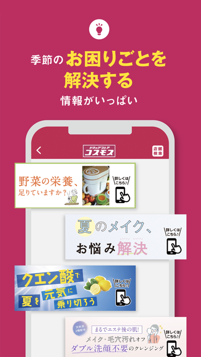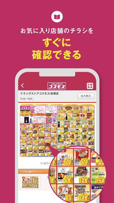 ドラッグストアの特売や新商品を、手元でさっと確認できるコスモスの公式アプリです。お気に入り店舗のチラシ、すぐ使えるクーポン、オンラインでの日用品・食品の注文までひとまとめ。家事や育児の合間にお得を逃さず、必要なものをまとめて買いやすくなります。