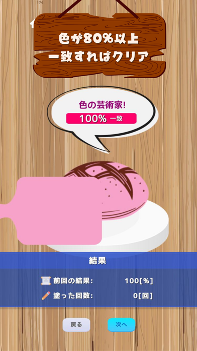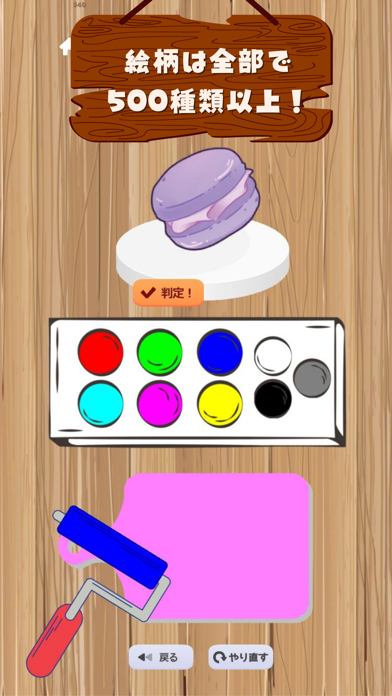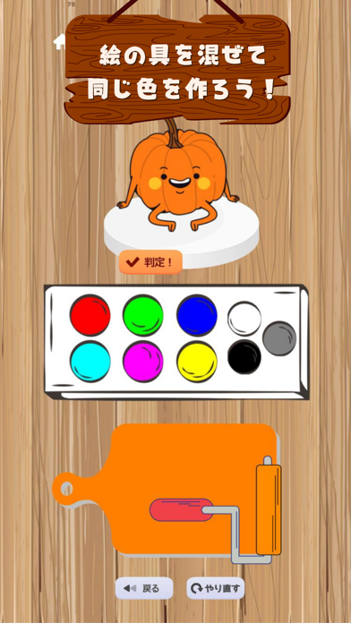 赤や青など9色の絵の具を混ぜて、お題のイラストに近い色を作ります。判定をして、色の一致率が高いとクリアです。まずは、通常モードで感覚をつかむのがおすすめ。回数を重ねるうちに、赤の上に黄色を重ねるとオレンジになるといった色の作り方を覚えられます。