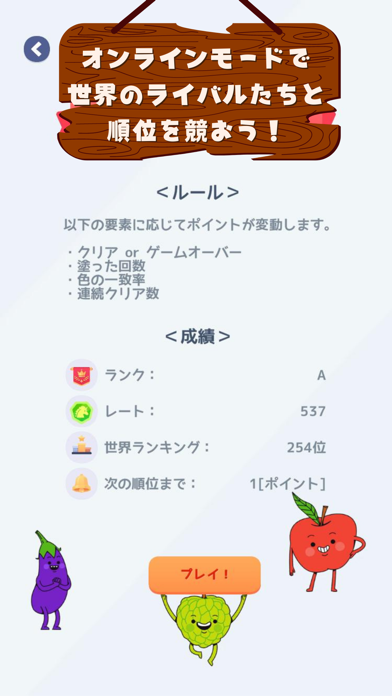 慣れてきたら、競技性のあるポイントモードに挑戦。絵の具を混ぜられるのは1つのお題につき10回までで、その中でお題の色にどれだけ近づけるかが重要です。塗った回数や色の一致率などに応じてレートが変動。世界中のプレイヤーとレートを競うランキングもあります。