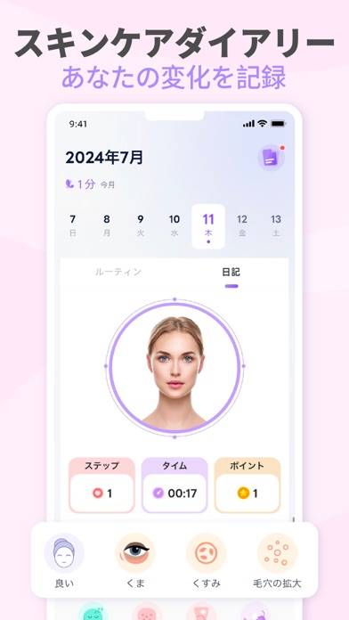 - 肌の状態や睡眠時間を日記で記録。スキンケアリポートが毎週届く