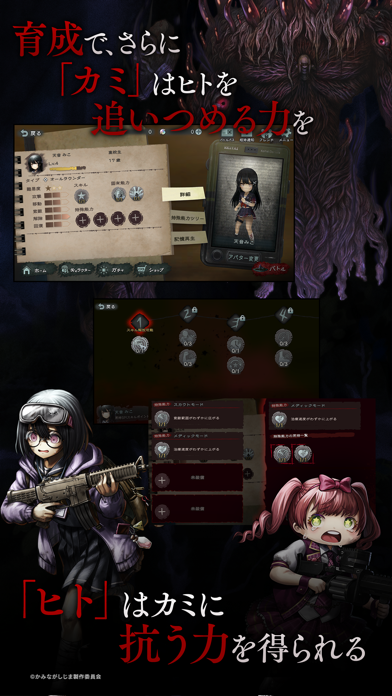 特殊能力や装備を駆使して戦闘を有利に進められます。ヒト・カミともにキャラごとに特殊能力を所持しています。移動速度UPや攻撃力増加、オオカミの召喚や憑依などの能力が利用可能。キャラの成長により、能力の強化もありますよ。