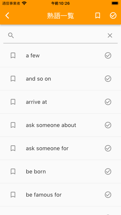 単語や熟語を覚えたら「覚えた」をタップしてチェック。すると、チェックしたものは表示されなくなり、覚えられないものだけを復習できます。チェックした単語や熟語は一覧で確認可能。学習の進行状況を把握しやすく、効率的に単語や熟語を覚えられます。