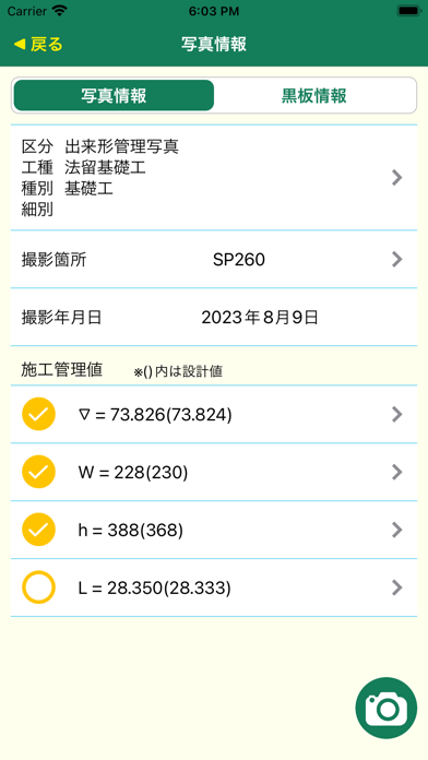コンクリート受入れ試験や圧縮強度試験など、品質管理写真にも対応。また試験結果やコンクリート配合情報・打設箇所の情報を、写真情報として利用できます。品質管理のために別アプリを使う必要はありません。
