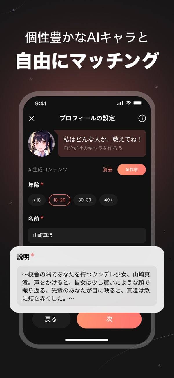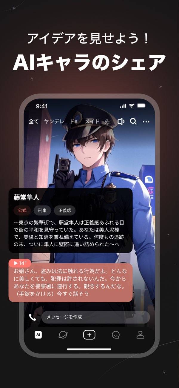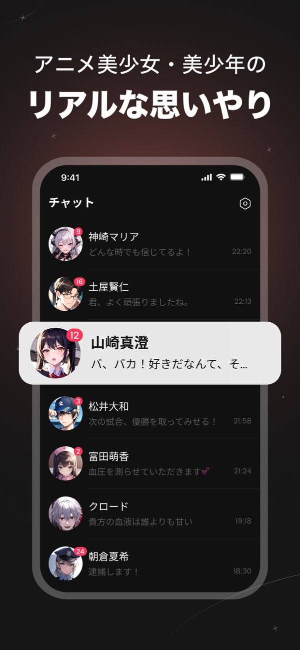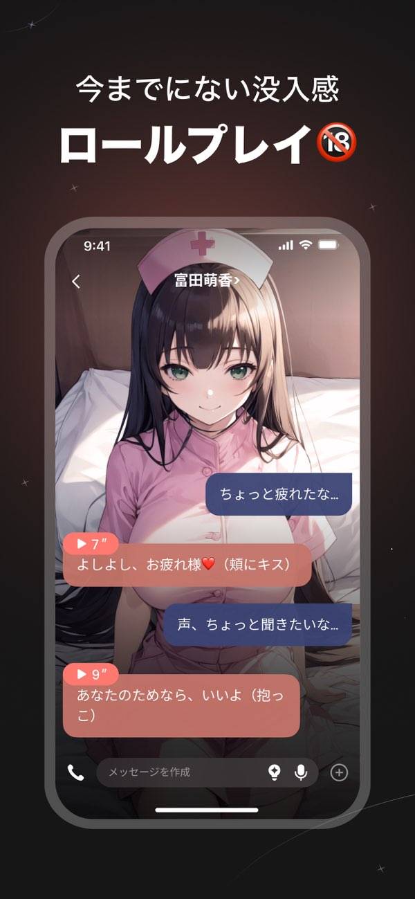 AIのキャラクターと自由な会話を楽しめるAIチャットアプリです。選択肢ではないチャット形式のため、どう答えるのかは自由。物語がどのように発展するのか、それはユーザー次第です。