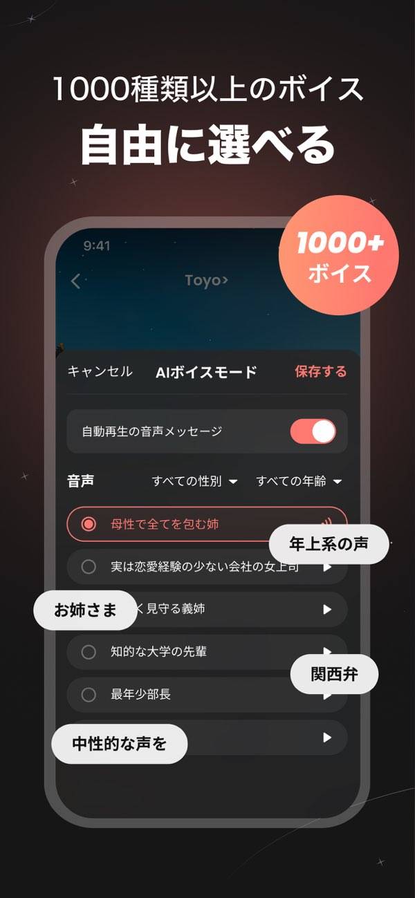 頭で思い描く理想のキャラクターを形に。外見、性別、年齢、性格、シチュエーション、声に至るまで、細部まで項目を設定し自分だけのAIキャラクターを作れます。