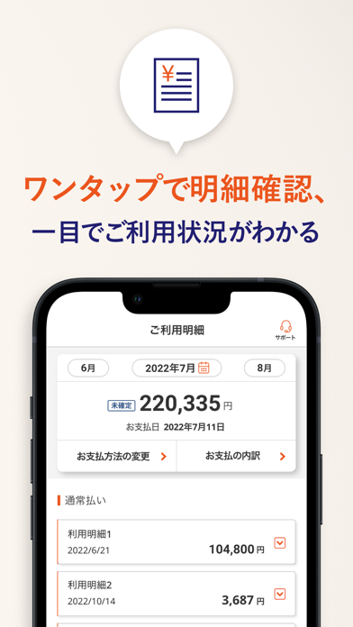 アプリを開くと、カードの請求額などの基本情報が一画面に表示。カード情報の確認もサクッとできます。月ごとの利用明細も確認可能。支払方法の変更もアプリから申請でき、分割払いとリボ払いから選べます。