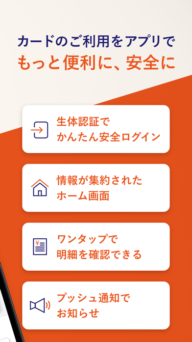 顔や指紋認証を使って、本アプリに簡単にログインできます。アプリを開くたびにパスワードを入力する必要もなく、ストレスなくカードの請求額を確認可能。セキュリティの確保とアプリの利便性を兼ね備えています。