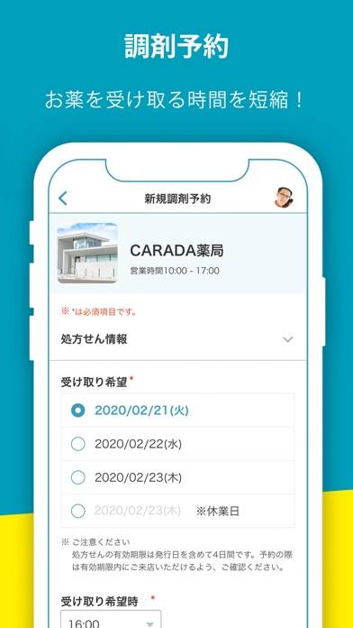 • 処方箋の写真を薬局に送信して受け取り予約。希望日時も指定可能