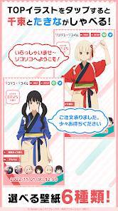 メイン画面では時計と一緒に、千束やたきなのイラストが見られます。本編キービジュアルやキャラクターのメインビジュアルなど6種から壁紙を選び、スマホ画面に表示しましょう。画面をタップすると、キャラクターに応じてランダムにボイスが再生されます。