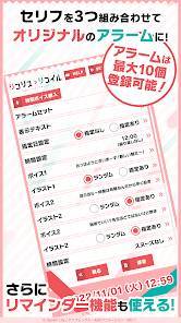 アラームの時間になると、設定したイラストとボイスで教えてくれます。ボイスとイラストはアラーム1件につき3種類ずつ指定でき、毎回どれかがランダムに選ばれる仕様なので、鳴るたびにワクワクです。アラームは最大5件セットできるため、実用性も十分。
