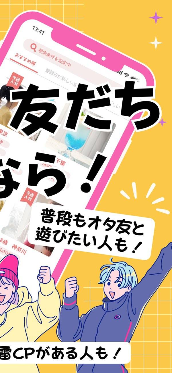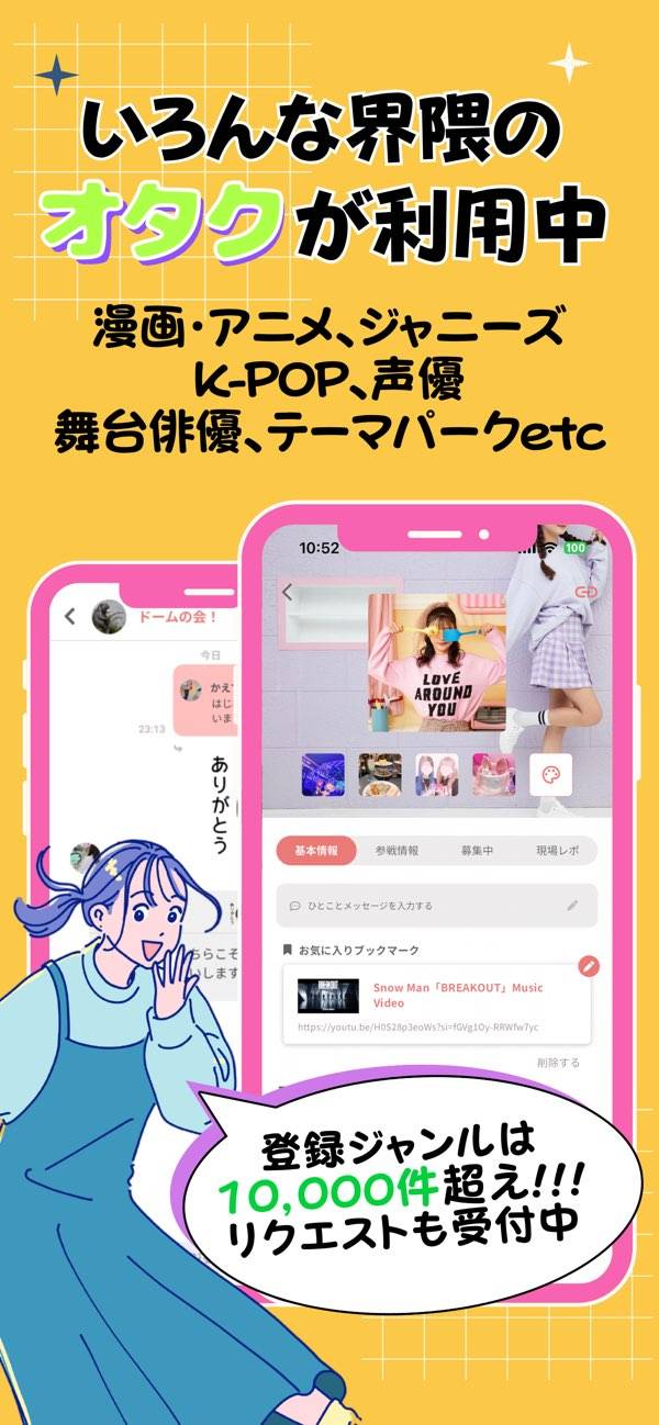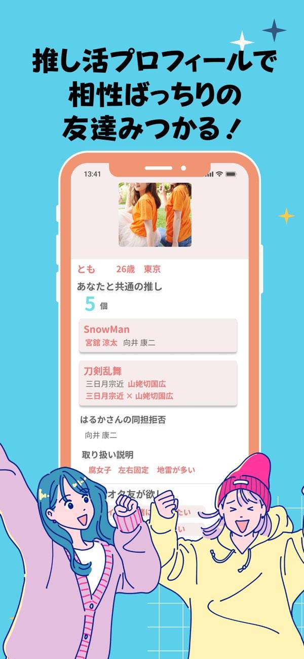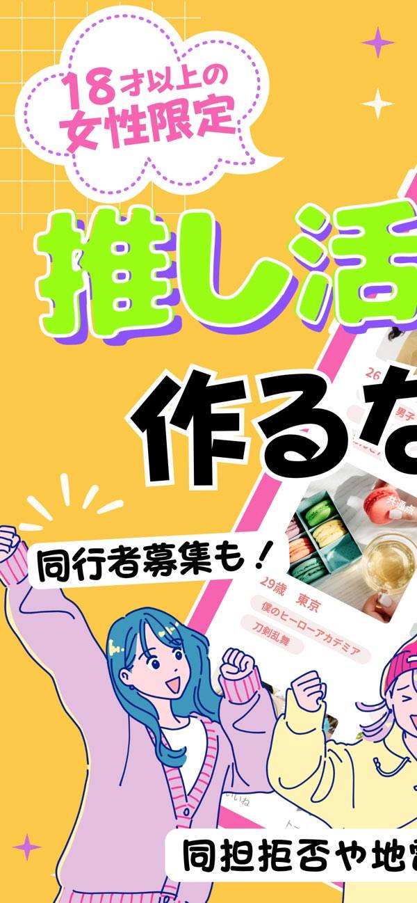 同じ推しや趣味を持つ友達を探せる、18歳以上の女性限定マッチングアプリ。アイドルグループやアニメ、Vtuber、スポーツなど幅広いジャンルに対応しています。プロフィールでは、推しメンや推し活スタイルなど細かい情報を共有可能。自分に合うオタ友を見つけたり、アプリ内でチャットをしたりできます。