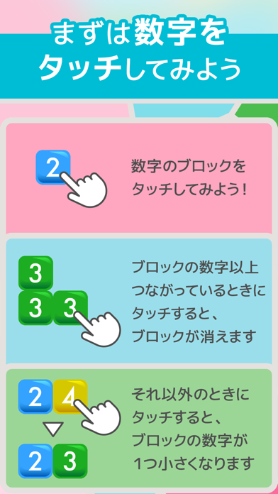 時間経過とともに、下から増えていくブロックを消去。頂上に達しないように、数字のブロックを消していきましょう。1のブロックは1個で消せるので、優先的にタップするのがスコアを伸ばすコツ。